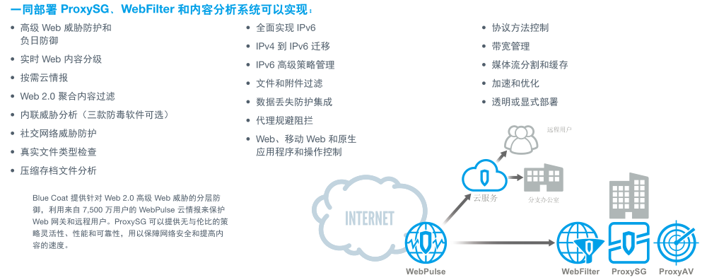 ProxySG can provide comprehensive protection and control for Web traffic. It can provide the following functions: powerful user authentication, Web filtering, in-depth inspection of data loss and threats, security checks based on Blue Coat's global intelligence network, SSL streaming