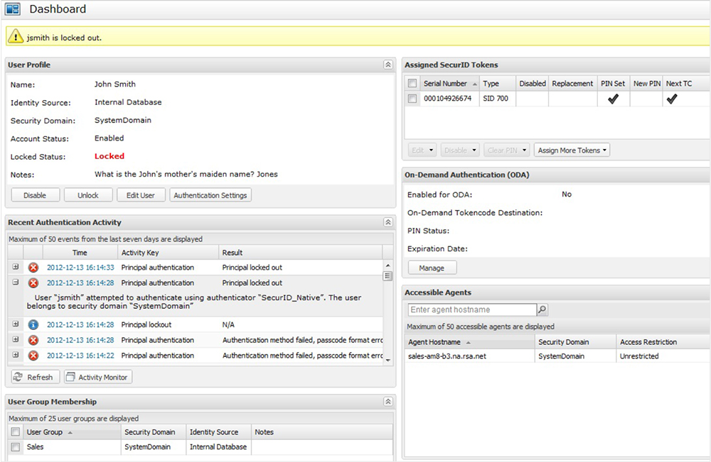 RSA Authentication Manager includes some built-in features that can solve the most time-consuming and expensive tasks related to managing enterprise authentication suites. The user dashboard is a convenient single-pane view designed to allow service desk administrators to quickly resolve the most common user query requests without running multiple reports or multiple searches. The customizable self-service console allows users to manage their own authentication methods and is another feature that can save IT staff time. The self-service portal is deployed in the DMZ area of the network, allowing users to change their PIN, apply for token replacement, apply for emergency access, and use other troubleshooting services.