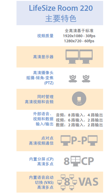 you have LifeSize Room 220, you can get the highest quality enjoyment-for example, the highest full HD on the market, the standard-based 1080p30 resolution, and the best resolution for processing actions can reach 720 p60, with lower latency than other similar systems. LifeSize Room 220 comes standard with a built-in 8-channel split-screen multi-point bridge (which can display 4 visual sites), and has code conversion and full digital input/output capabilities. In addition, the LifeSize Room 220 can reach a point-to-point throughput of 8Mbps. Moreover, the equipment is compact in structure, beautiful in shape, and less than half the size of similar solutions.
