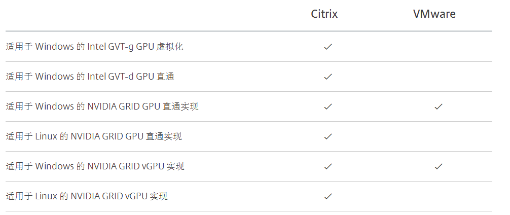 XenServer 7 is a leading hypervisor that provides high-performance enhanced 3D graphics support and has the widest range of GPU pass-through and virtualization GPU vendor options. Only XenServer includes support for Intel's Virtual Graphics Technology (GVT-g), which is a CPU-embedded GPU that promotes enhanced graphics workloads without additional hardware.